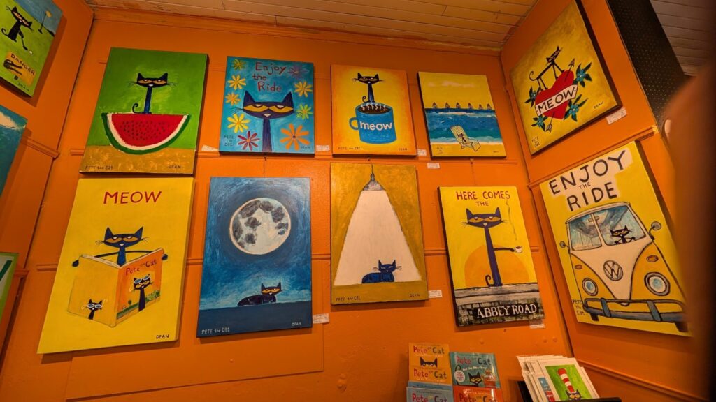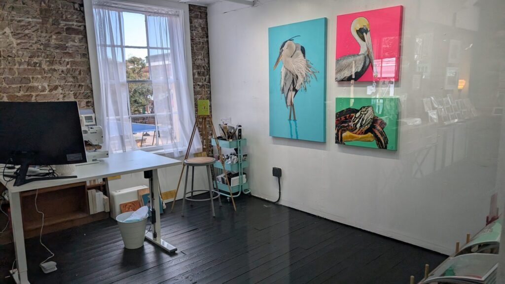 Walking district has many art galleries. I am very excited to get to know an artist who lives in West Virginia. His paintings are cute and whimsy. I love to discover random artists like this in small galleries. In these shops, downstairs are galleries, and upstairs are art studios which has big windows and you can walk in to talk to artists. I visited an artist and she is making a living by doing illustrations for people on social media like drawing a pet for them. In her spare time, she did her own collage art. She was talking to me about how she visualized things and put down as a painting over days. I love such sincere and genuine personality.